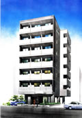 パースは、その建築物がまだ完成する前であっても、手前に邪魔物があっても、そのようなことには関係なく、空中からでも、どのような位置からでも、まったく自由に視点の位置を設定してその建築物を描き表すことができます。また、建築物の外壁にある電線の引き込み部分、換気パイプ、デザイン的に関係のない雨樋なども自由に省略します。手前の道路を走る車は好きな車種で描き、添景の人物も好みの位置に配置し、周囲の景観も許すかぎり自由に描くことができるのです。そういう意味で、パースは自由自在です。 |